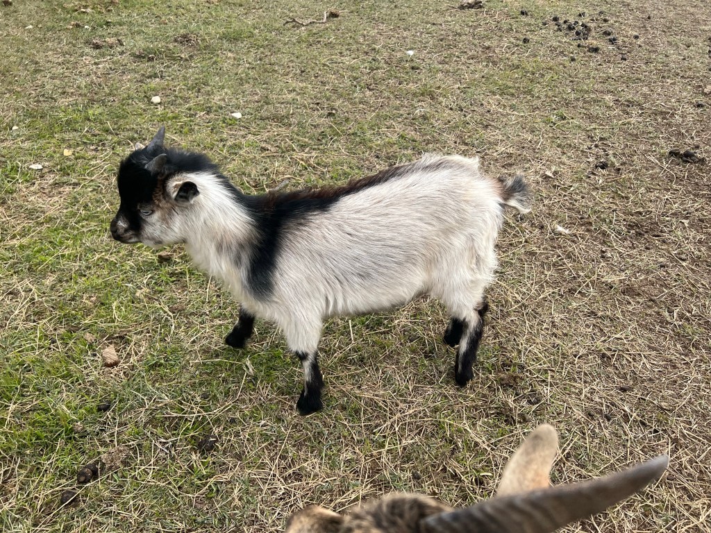 An adorable Pygmy Nigerian Dwarf goat baby with incredible markings. He has my favorite marking a I have seen so far! Super sweet and gentle little guy.